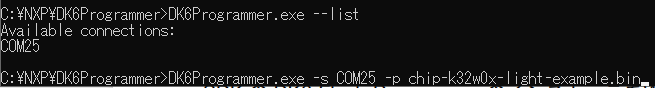 - DK6Programmer.exe と同じフォルダーに out/debug/chip-k32w0x-light-example.bin をコピーした場合、下記コマンドで書き込み可能です。