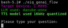# ./eiq_genai_flow --use-neutronPlease type yorur question: が出力されたら、プロンプトを入力後に Enter キーを押すと、レスポンスが返ってきます。