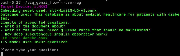 # ./eiq_genai_flow --use-ragPlease type yorur question: が出力されたら、プロンプトを入力後に Enter キーを押すと、レスポンスが返ってきます。