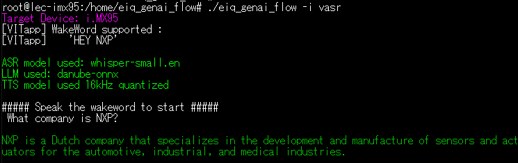 # ./eiq_genai_flow -i vasrSpeak the wakeword to start というメッセージが表示されたら、イヤホンマイクで "HEY NXP" を話しかけたあと、続けて質問します。