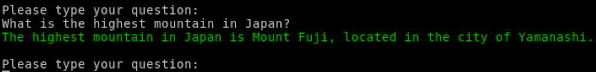 Please type yorur question: が出力されたら、プロンプトを入力後に Enter キーを押すと、レスポンスが返ってきます。